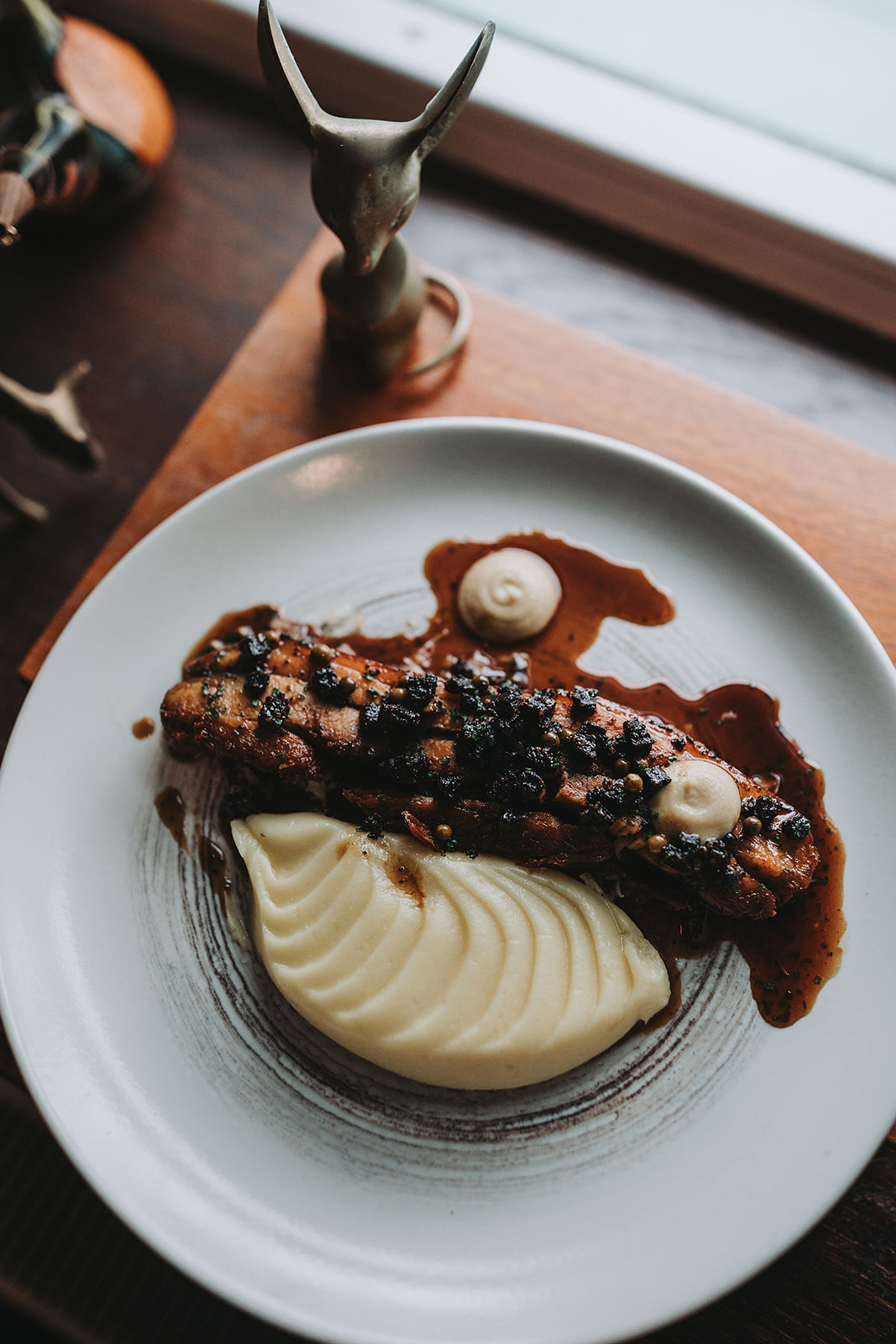 Slow-roasted pork rib with fermented cabbage, black pudding, Paris mash and apple mustard. Rich, hearty, and distinctly Scottish. Available on our dinner menu at £26.50, it's one of our most popular mains for good reason.